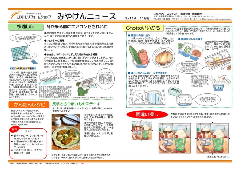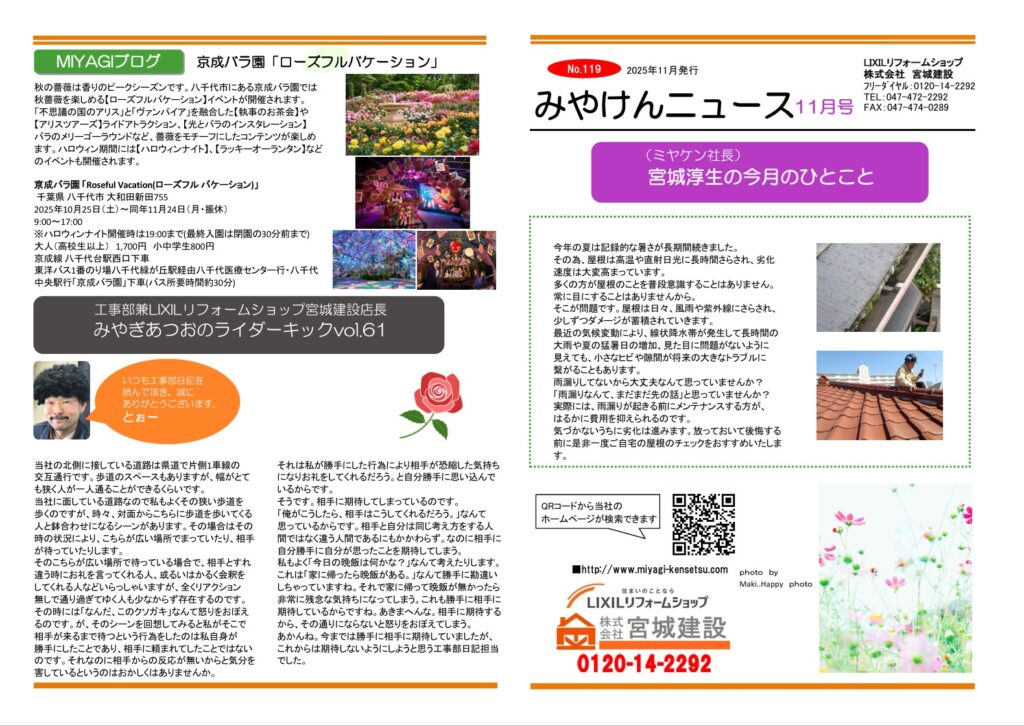みやけんニュース11月号 NO.119(2025年11月発行) みやけんニュース LIXIL 2025.11.01 Tweet みやけんニュース 2025.11月号 宮城建設が毎月発行しているニュースレター 「みやけんニュース」No.119(2025年11月発行)です。 毎日の生活に役立つ情報やイベントのお知らせが満載です。 是非ご一読ください Tweet