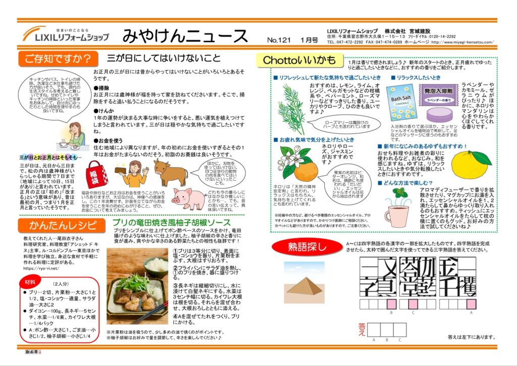 みやけんニュース1月号 NO.121(2026年1月発行) みやけんニュース LIXILニュースレター 2026.01.01 Tweet みやけんニュース 2026.1月号 宮城建設が毎月発行しているニュースレター 「みやけんニュース」No.121(2026年1月発行)です。 毎日の生活に役立つ情報やイベントのお知らせが満載です。 是非ご一読ください Tweet