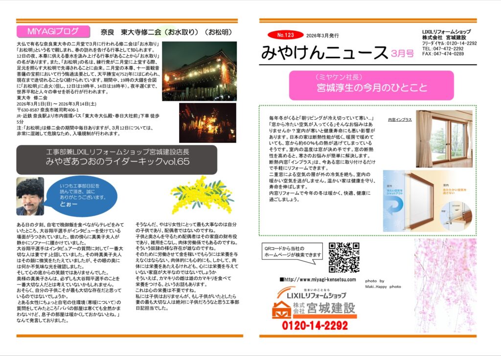 みやけんニュース3月号 NO.123(2026年3月発行) みやけんニュース LIXILニュースレター 2026.03.01 Tweet みやけんニュース 2026.3月号 宮城建設が毎月発行しているニュースレター 「みやけんニュース」No.123(2026年3月発行)です。 毎日の生活に役立つ情報やイベントのお知らせが満載です。 是非ご一読ください Tweet